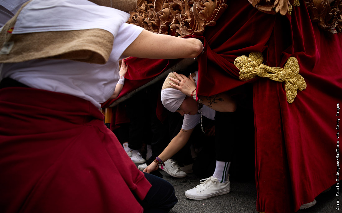 Женщина, несущая платформу, во время шествия в Великий понедельник в Гранаде, Испания