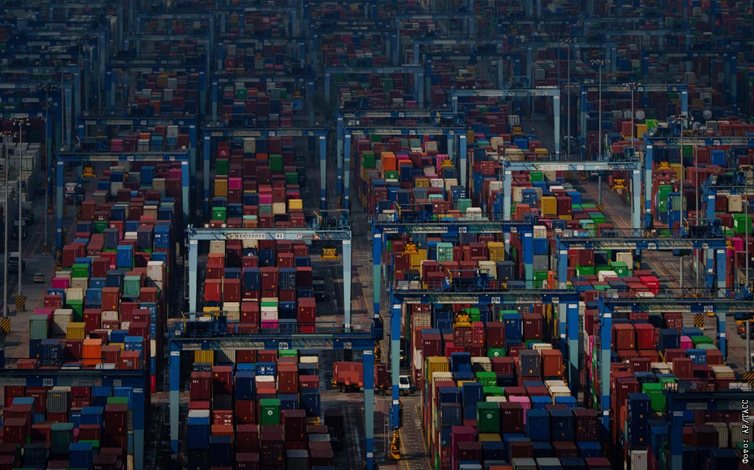 Скопление грузовых контейнеров в морском порту Кланг в Малайзии