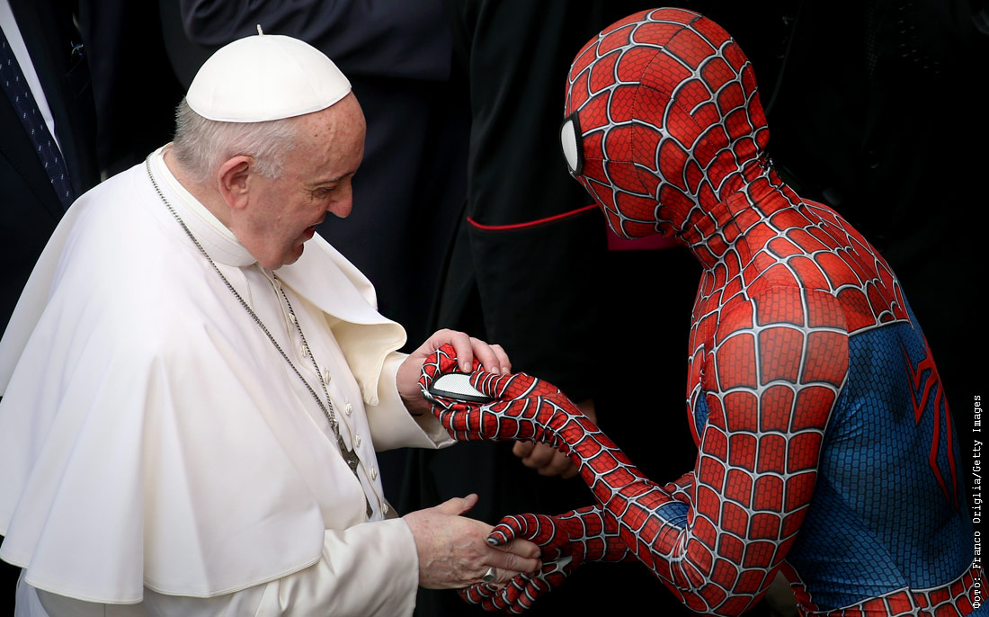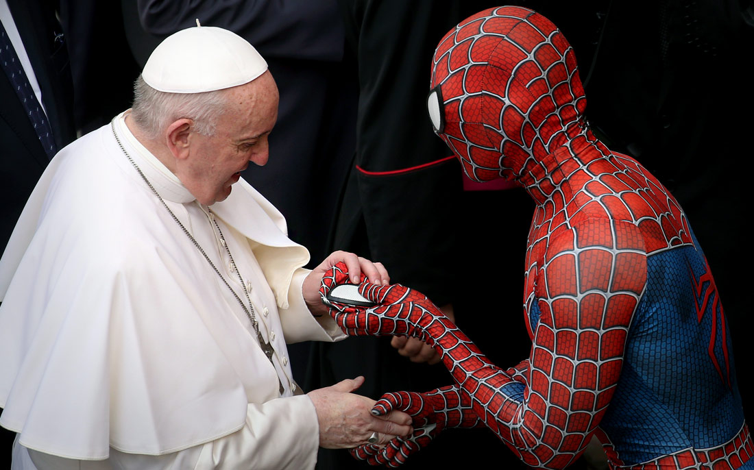 Мужчина в костюме Человека-паука дарит понтифику свою маску во время еженедельной общей аудиенции в Ватикане. Июнь 2021 года.