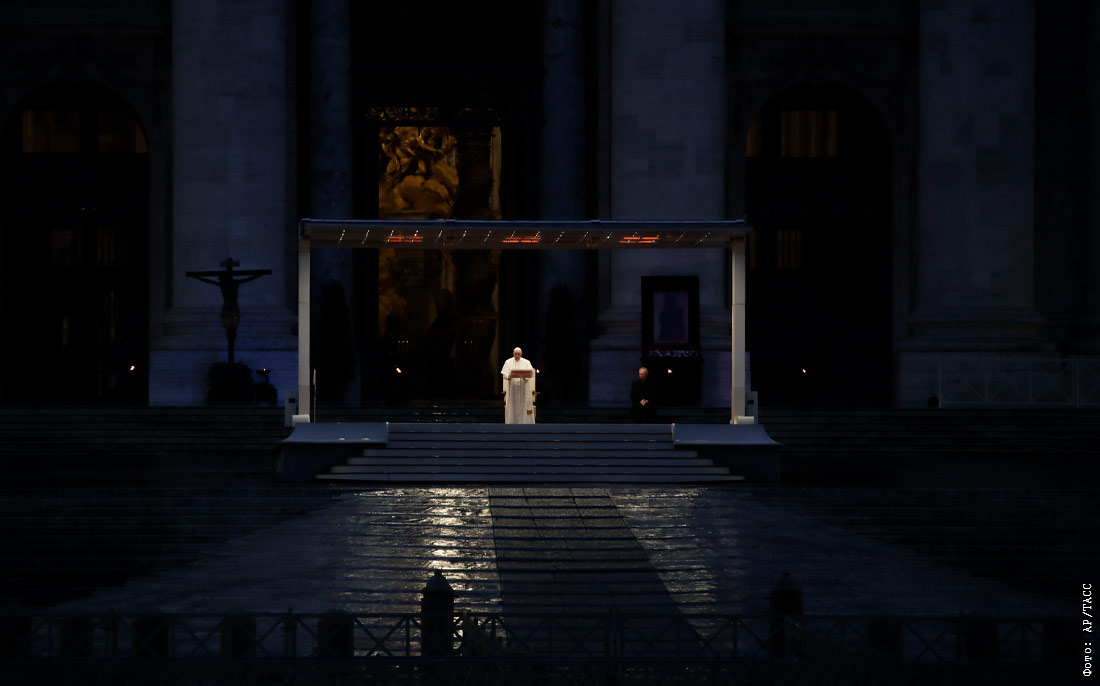 Папа римский Франциск выступает на пустой площади Святого Петра с обращением "Граду и миру", в ходе которого молится о завершении пандемии коронавируса. Март 2020 года.