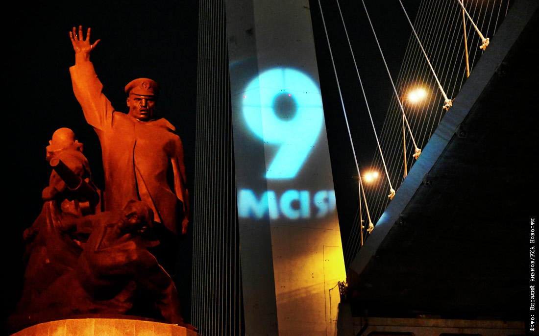 Голограмма с символикой Дня Победы на пилоне Золотого моста во Владивостоке