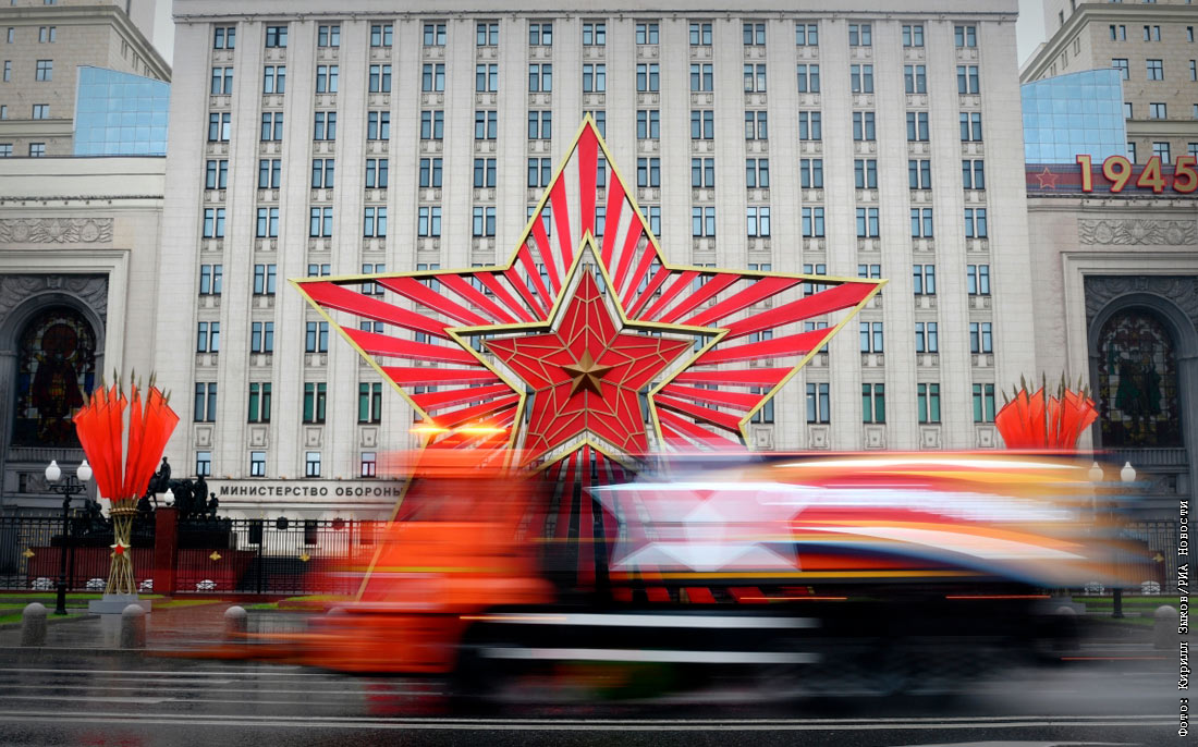 Декоративная инсталляция "Звезда Победы" возле здания Министерства обороны Российской Федерации на Фрунзенской набережной в Москве
