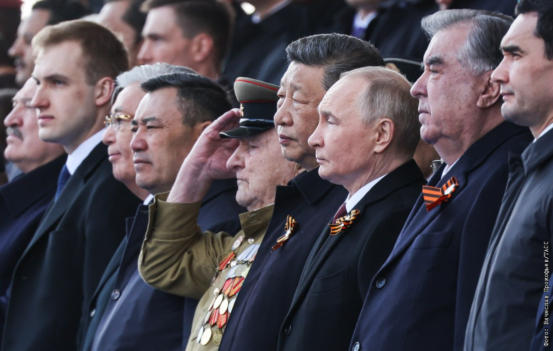Эмомали Рахмон (второй справа), Владимир Путин (третий справа), Си Цзиньпин (в центре), Садыр Жапаров (четвертый слева), Касым-Жомарт Токаев (третий слева), Александр Лукашенко (слева)