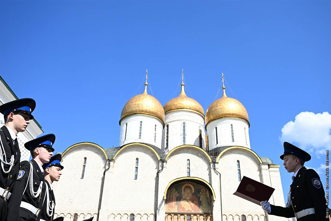Учащиеся кадетских и юнармейских классов ФСО России на церемонии приведения к торжественным клятвам на Соборной площади московского Кремля