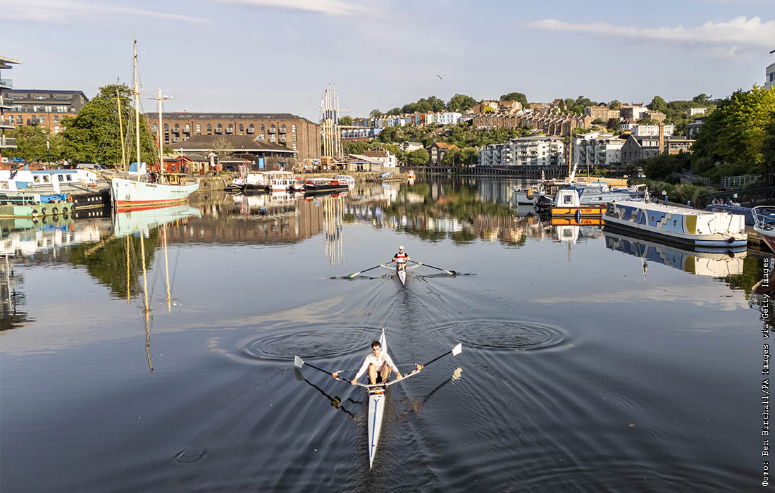 Гребцы плывут вдоль берега Бристольской гавани в Великобритании