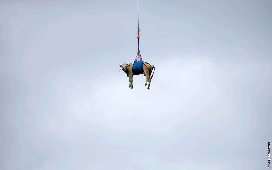 Корову эвакуируют на вертолете из зоны оползня близ горы Битшхорн в Швейцарии