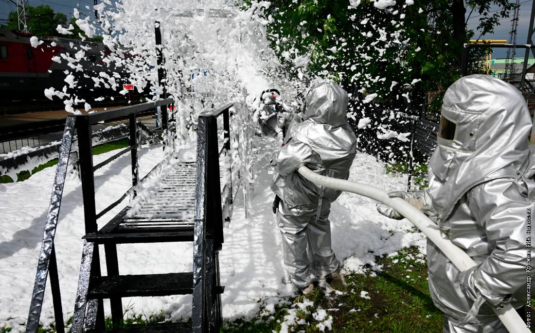Тренировка пожарной бригады на станции Инская Западно-Сибирской железной дороги в Новосибирске