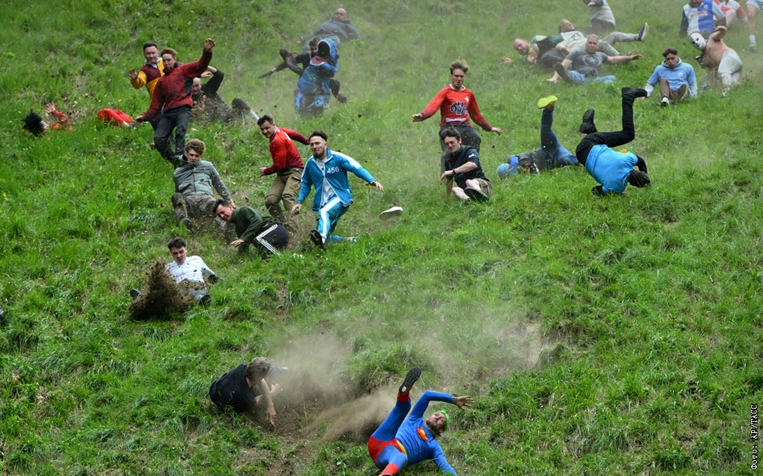 Ежегодная "Куперсхилдская сырная гонка" в английском графстве Глостершир. Участники соревнования пытаются догнать 5-килограммовую головку сыра, спускаемую вниз по склону.