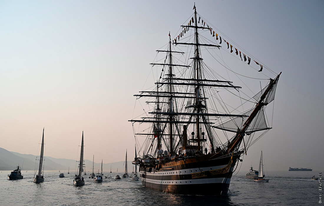 Итальянский корабль Amerigo Vespucci прибывает в конечный пункт кругосветного путешествия, в порт Генуя