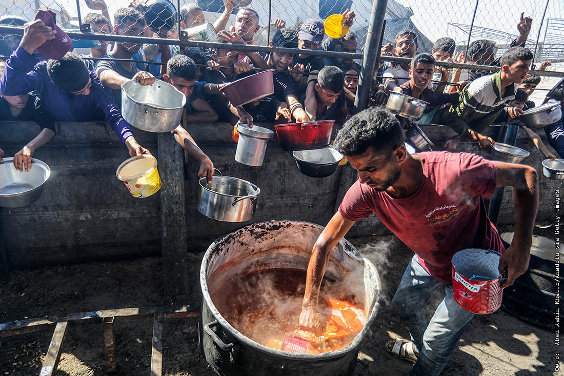 Раздача горячей еды в лагере для перемещенных палестинцев в Газе