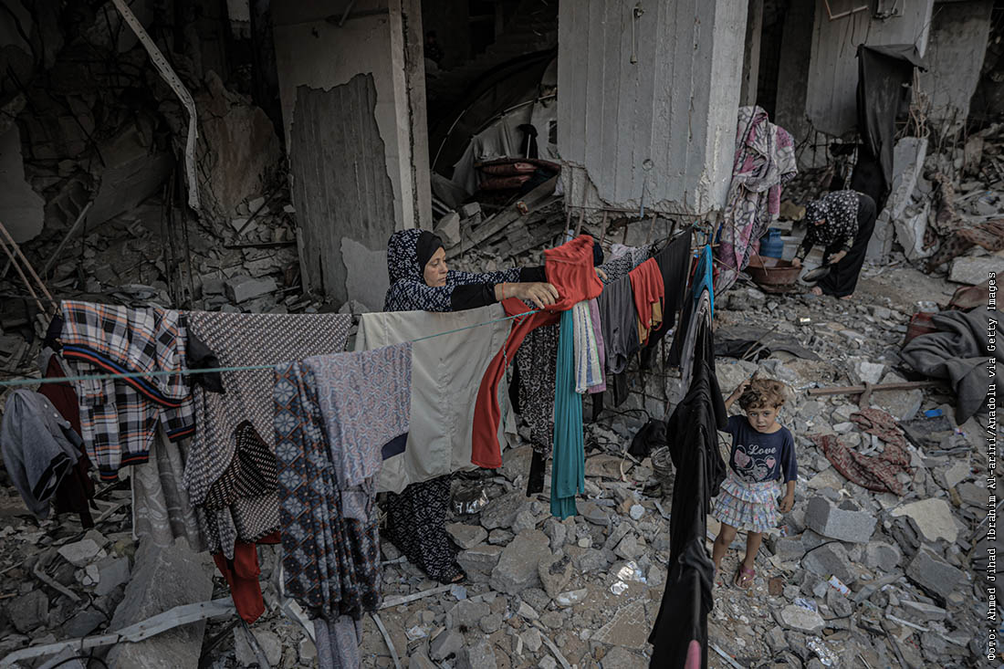 Женщина развешивает одежду для сушки в Газе