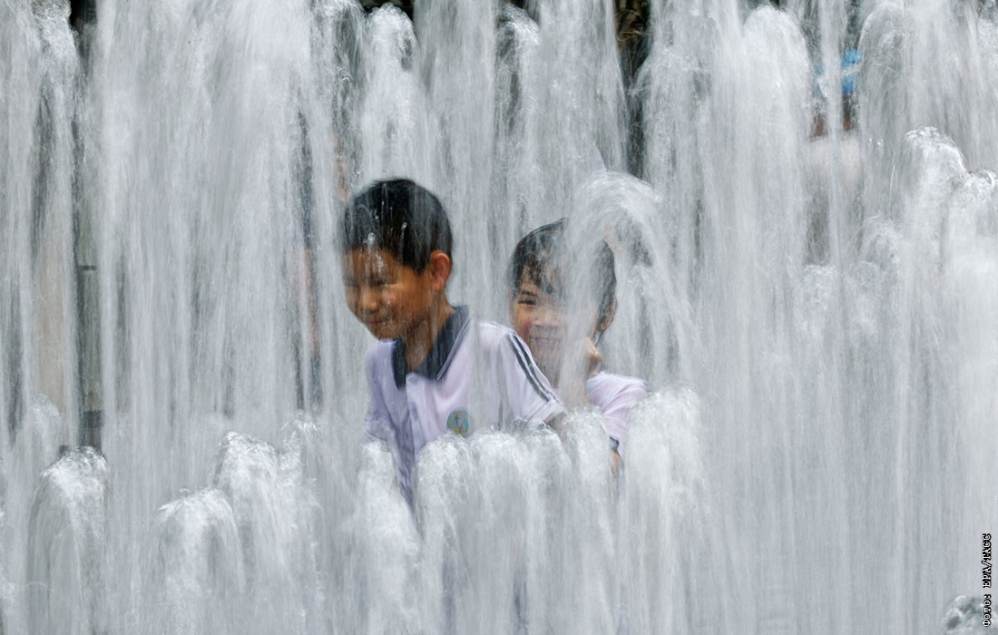 Дети спасаются от жары в фонтане, Шанхай