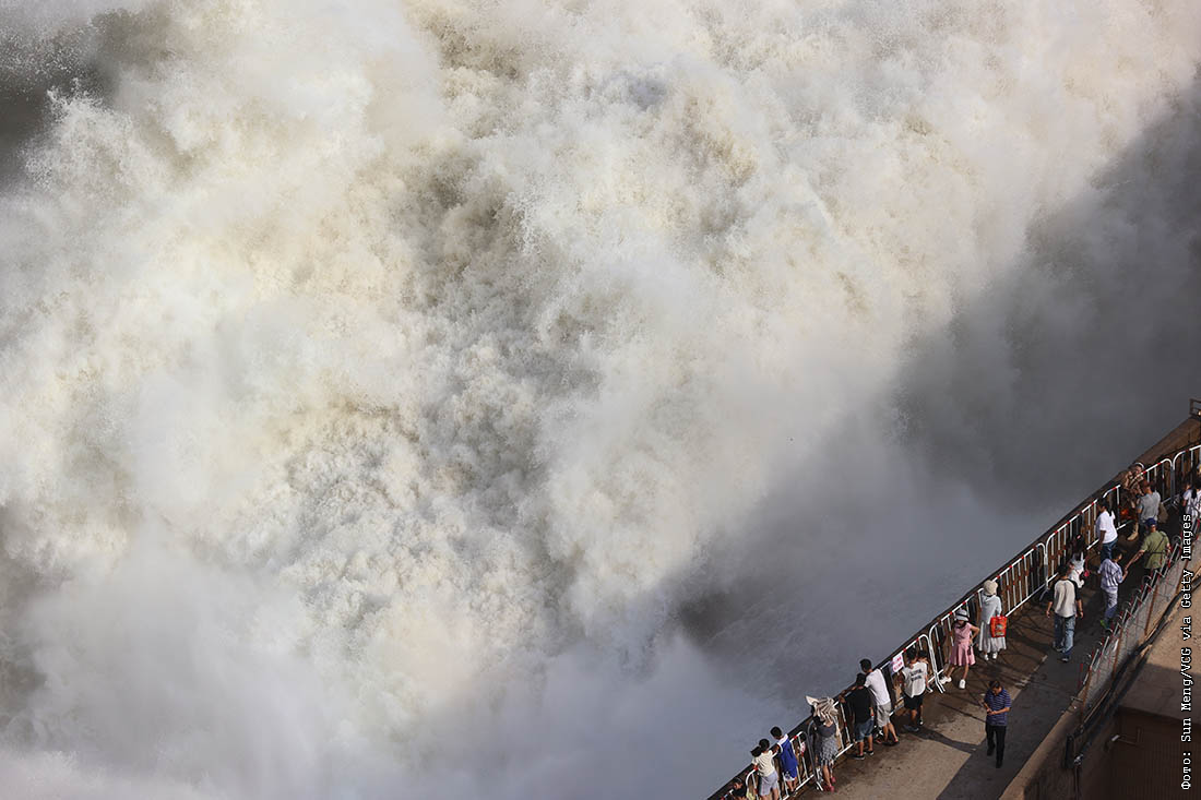 Люди наблюдают за сбросом воды из водохранилища на Желтой реке в Китае