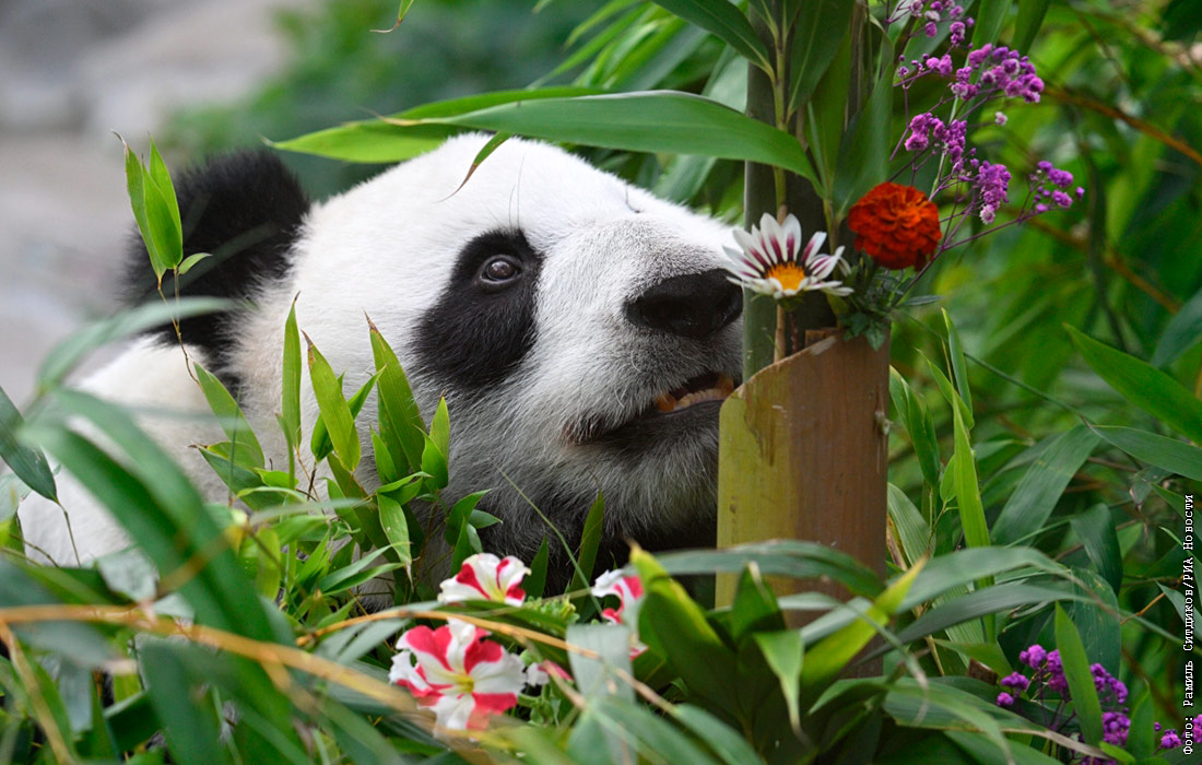 Панда Диндин во время празднования дня рождения в Московском зоопарке