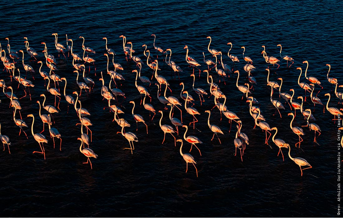 Фламинго на плотине Гелингуллу, которая является местом обитания, отдыха и размножения многих видов перелётных птиц в Йозгате, Турция