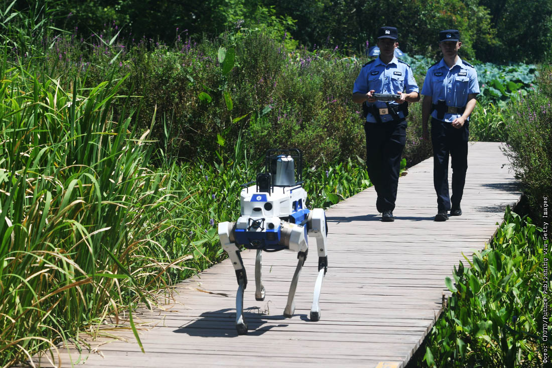 Полицейские испытывают полицейского робопса в Гуанчжоу