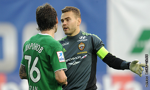 Игрок "Рубина" Роман Шаронов и вратарь армейцев Игорь Акинфеев (слева направо) в матче чемпионата России по футболу: ЦСКА (Москва) – "Рубин" (Казань) - 2:0.