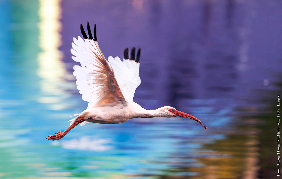 Белый ибис летит над парком Лейк-Эола в Орландо, США