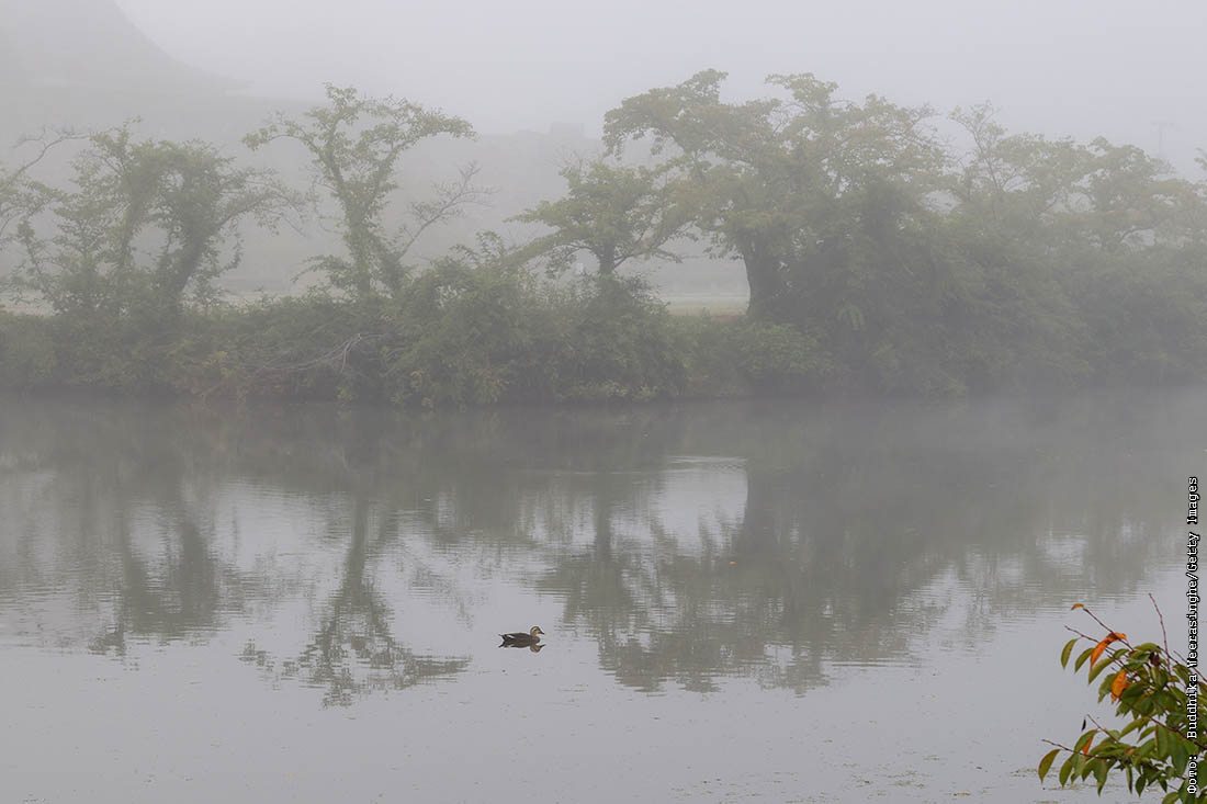 Утка плавает в водоеме в окрестностях замка Сасаяма, Япония