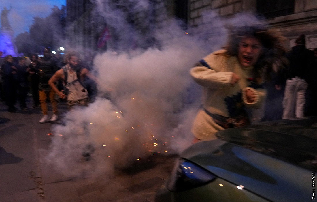Протестующий пытается уклониться от слезоточивого газа в Париже во время демонстрации после того, как флотилия судов с гуманитарной помощью, направлявшаяся в Газу, была перехвачена Армией обороны Израиля