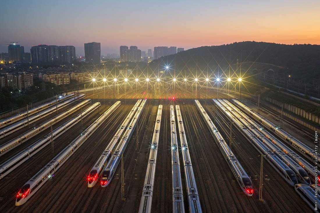Пассажирские поезда на железнодорожной станции в Нанкине (Китай)