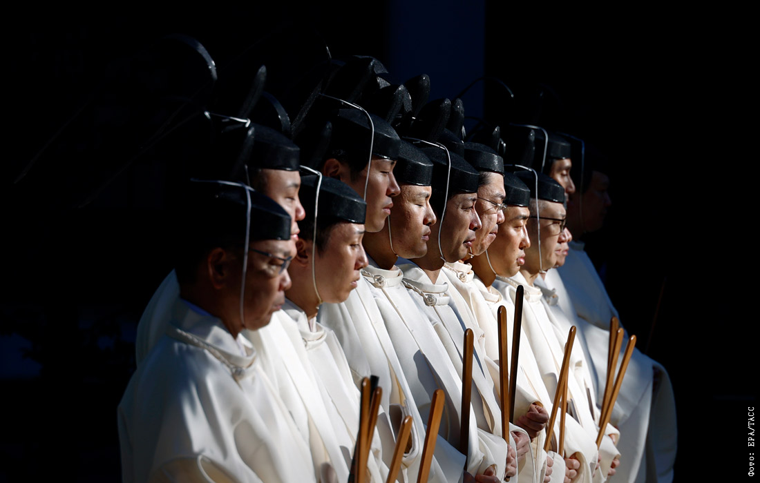 Синтоистские священники во время ритуала очищения по случаю начала осеннего фестиваля в храме Ясукуни в Токио