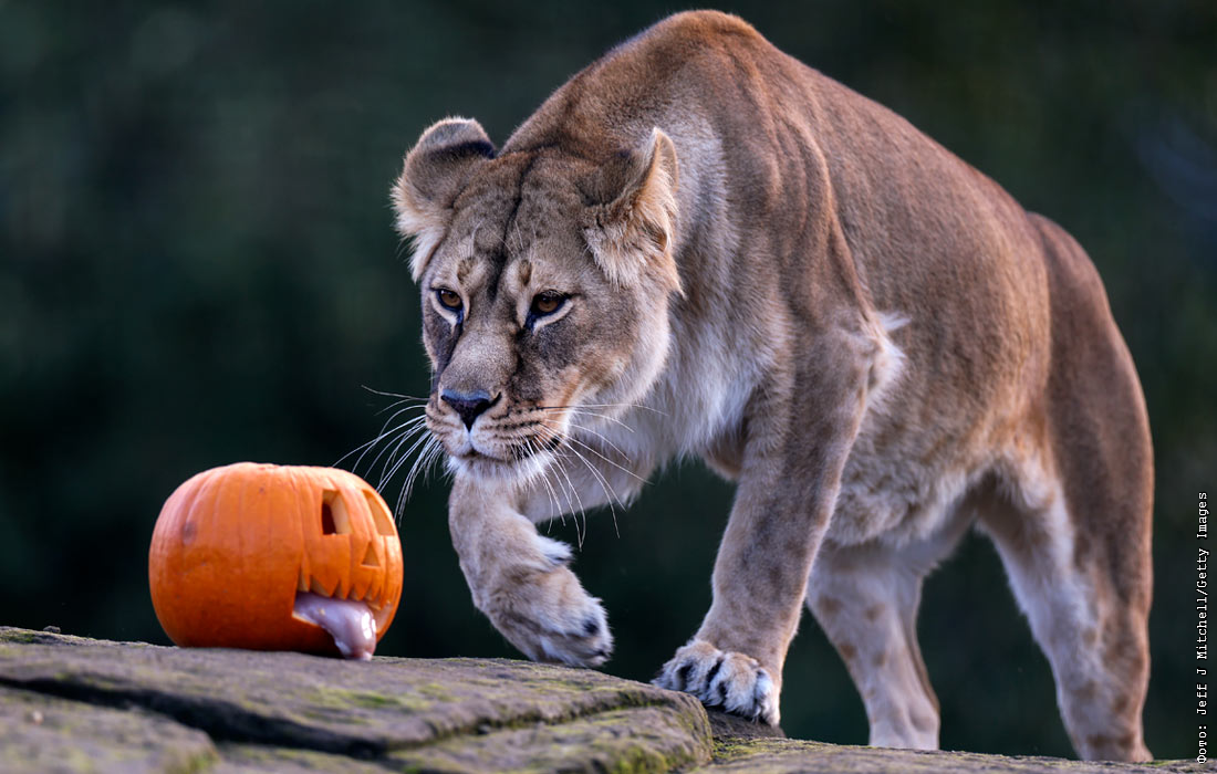 Львица осматривает тыкву в зоопарке в Уэст Колдер, Шотландия