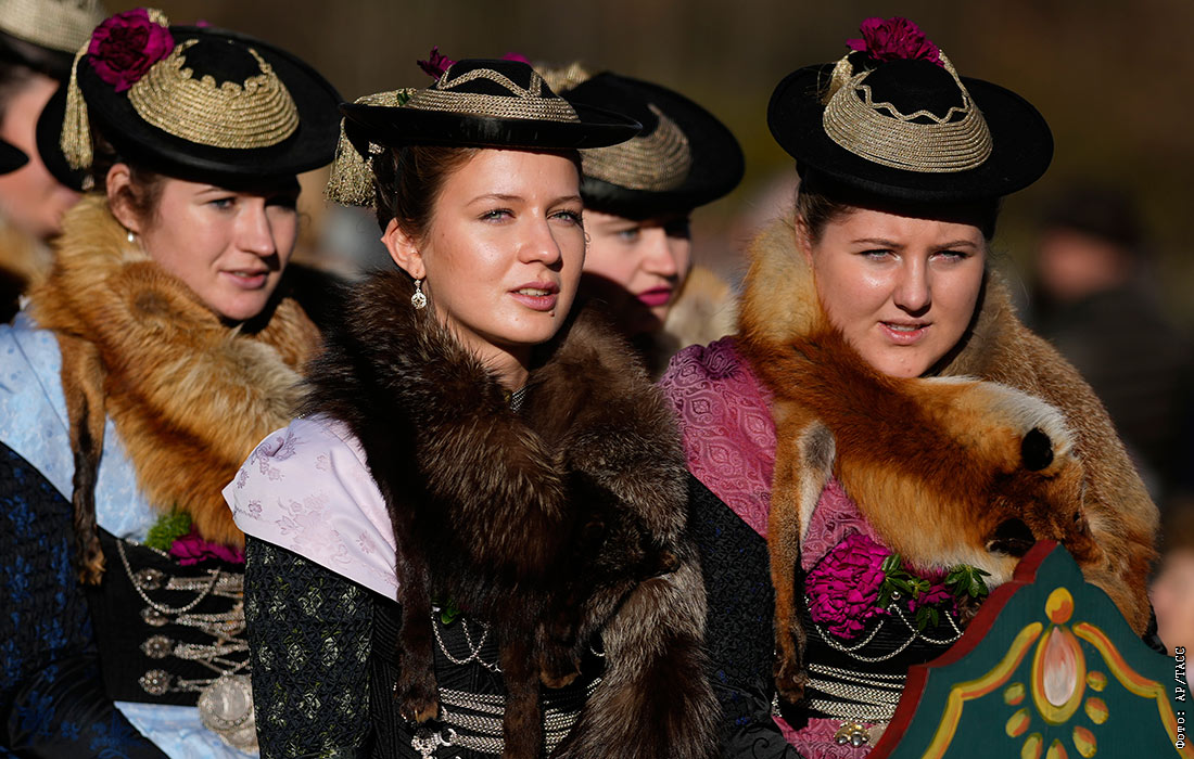 Девушки в национальных костюмах на конном параде в честь святого Леонарда в Баварии