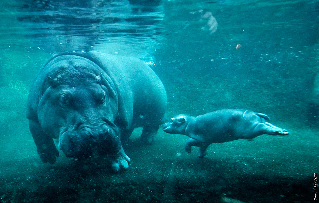Новорожденный карликовый бегемот Берлинского зоопарка впервые плавает в бассейне