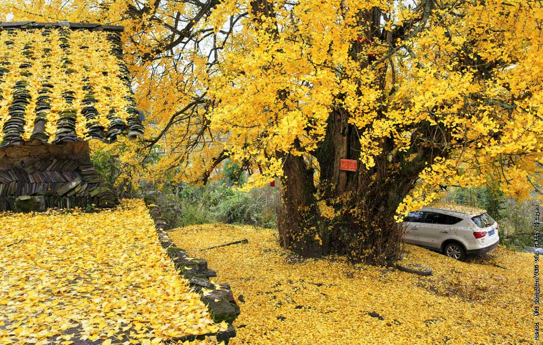 Опавшие листья 1500-летнего дерева гинкго в Гуйчжоу, Китай