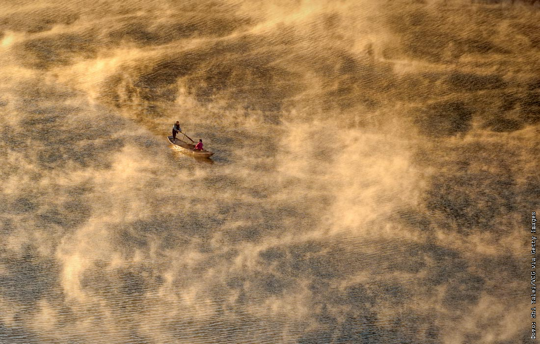 Утренний туман над рекой в Хуаншане, Китай
