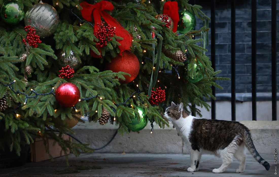 Кот Ларри у рождественской ели, установленной перед входом в лондонскую резиденцию премьер-министра Великобритании на Даунинг-стрит