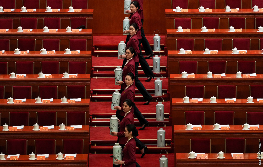 Девушки готовятся подавать чай в день открытия сессии Народного политического консультативного совета Китая в Доме народных собраний в Пекине