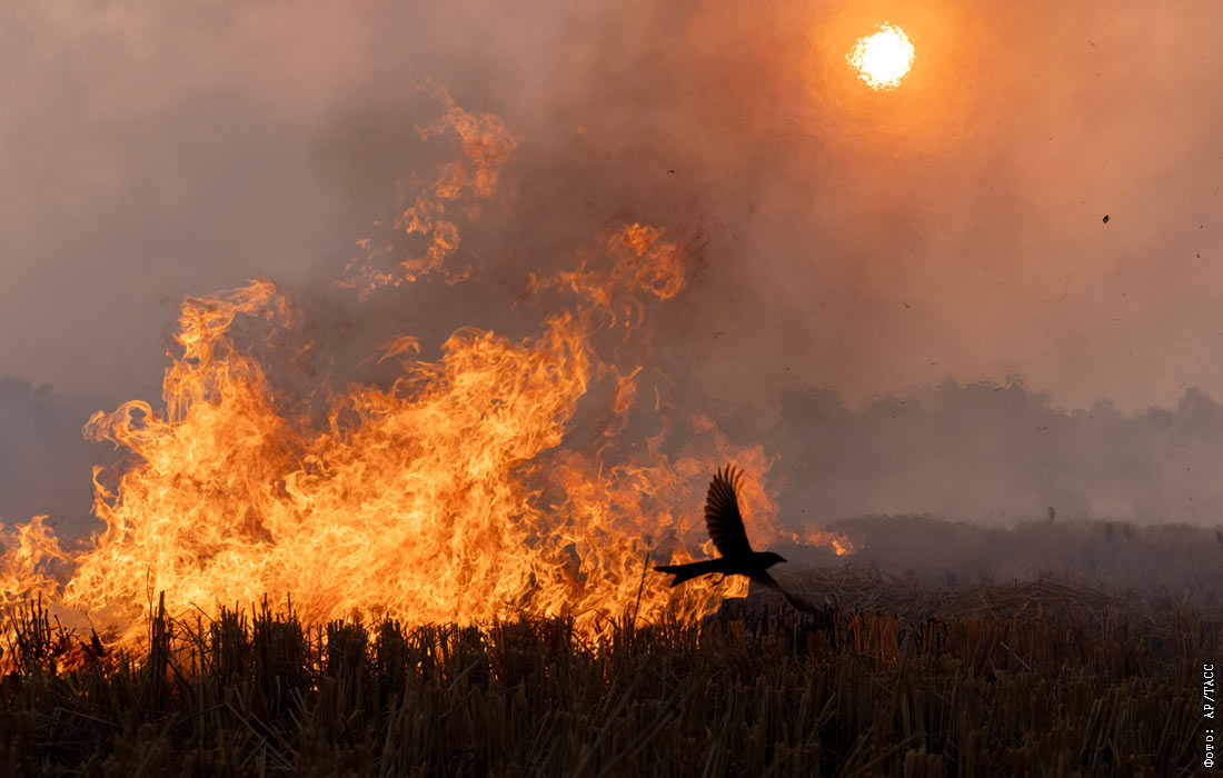 Сжигание стерни на полях после уборки урожая в северном индийском штате Уттар-Прадеш