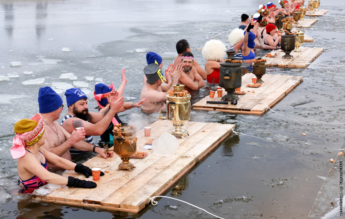 Купальщики во время установления рекорда России по самому массовому чаепитию в проруби в Малоярославце