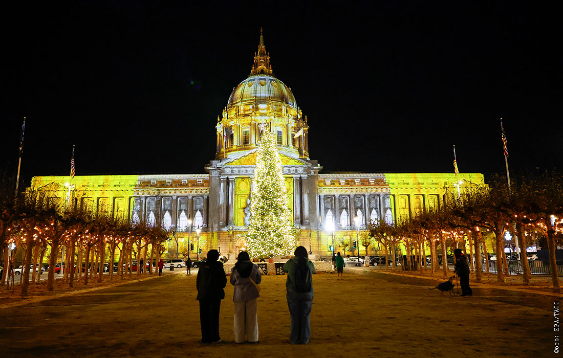 Световое рождественское шоу City Hall Winter Lights на фасаде здания мэрии в Сан-Франциско