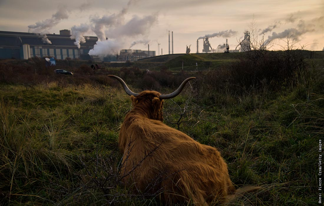 Корова породы Хайленд возле сталелитейного завода Tata Steel в Нидерландах