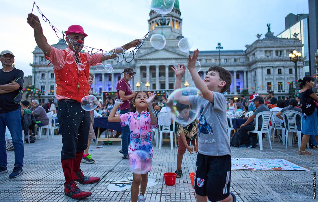 Дети играют с мыльными пузырями во время рождественского ужина, организованного профсоюзными активистами для нуждающихся, в Буэнос-Айресе