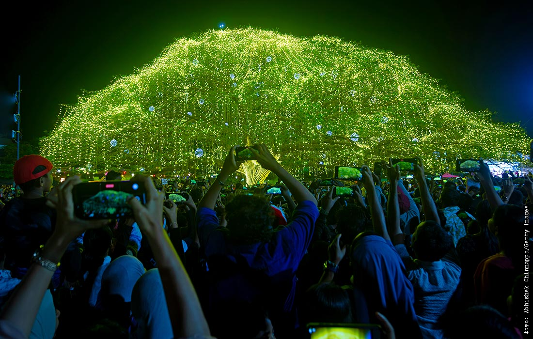 Люди фотографируют рождественскую елку в парке в Кочи, Индия