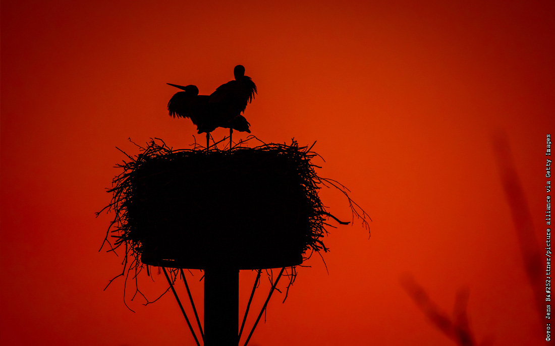 Аисты в гнезде после захода солнца на северо-востоке Германии