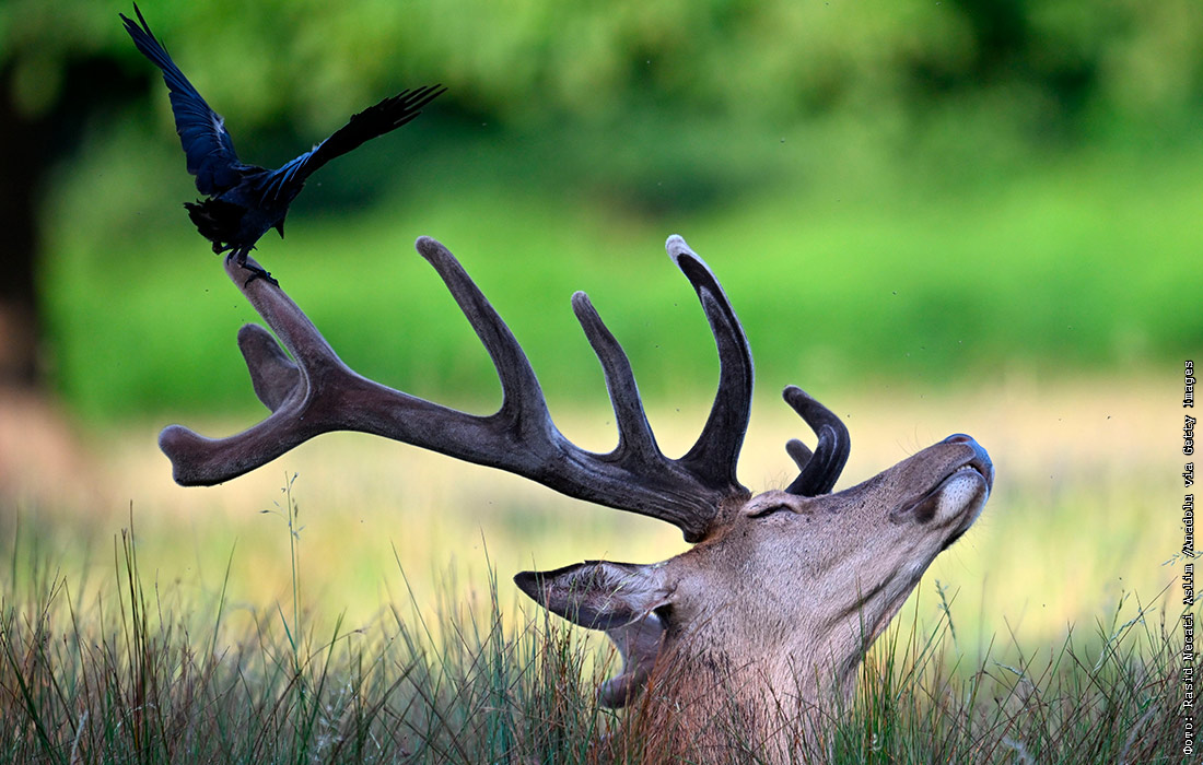 Птица сидит на рогах оленя в парке Буши, Лондон