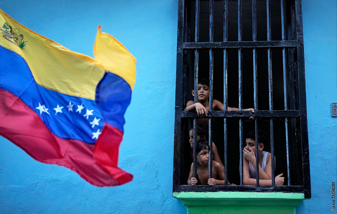 Дети смотрят из окна на марш сторонников правительства, требующих освобождения президента Николаса Мадуро и его жены в Ла-Гуайре на севере Венесуэлы