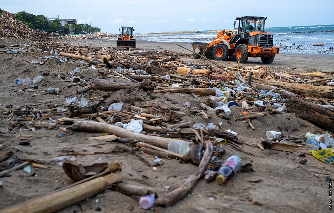 Скопление мусора на пляже Кута на острове Бали в сезон дождей