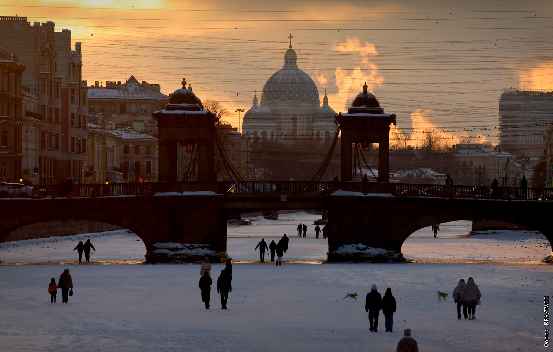 Жители Санкт-Петербурга гуляют по замерзшей Фонтанке