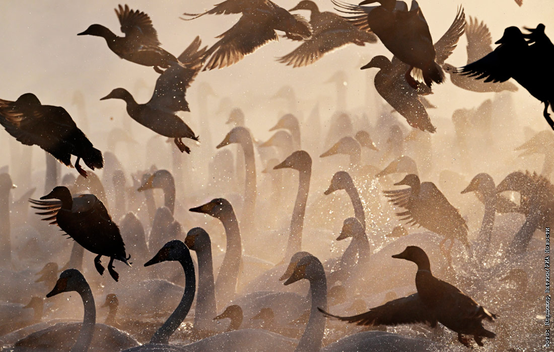 Ежегодно лебеди-кликуны прилетают на незамерзающее озеро Светлое в Алтайском крае, чтобы переждать суровую зиму