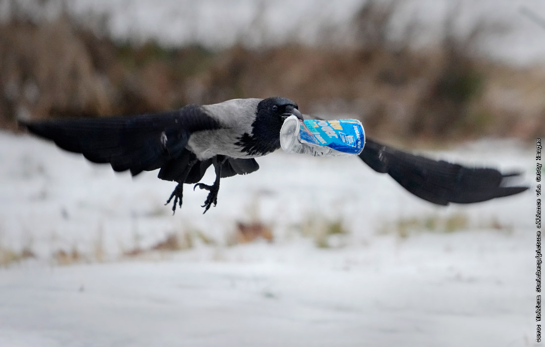 Ворон над заснеженным лугом с банкой в клюве, Берлин