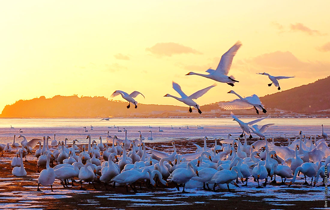 Лебеди на озере в уезде Жунчэн на востоке Китая