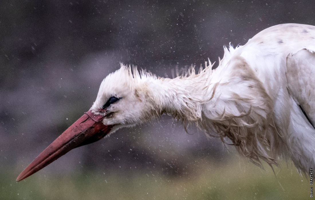 Аист под дождем в Гессене, Германия