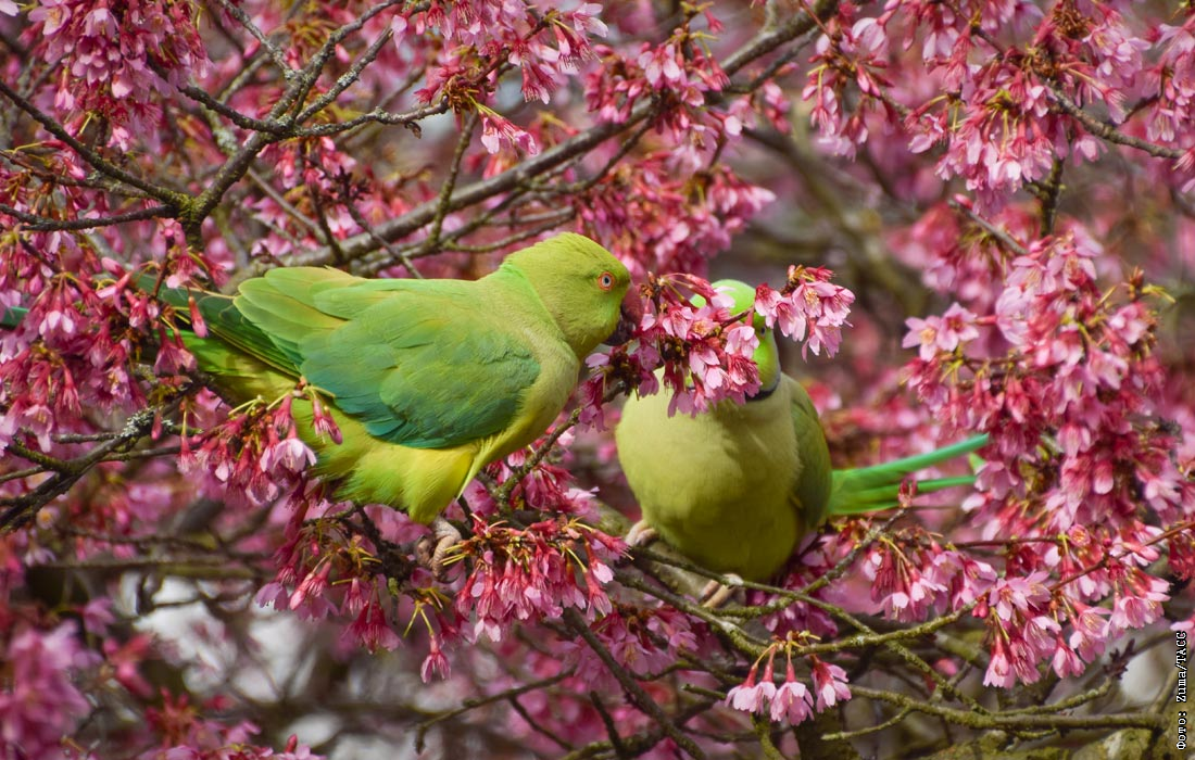 Индийские кольчатые попугаи среди цветущей вишни в Кенсингтонском саду в Лондоне