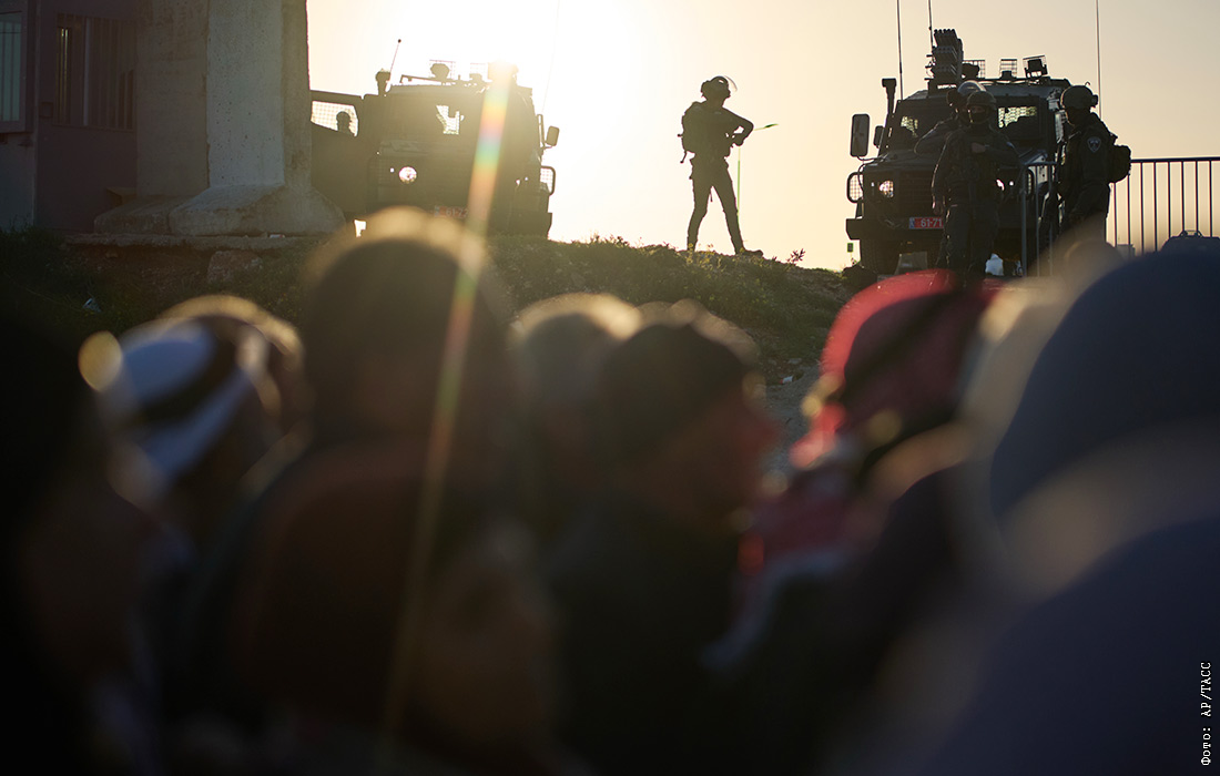 Израильские солдаты стоят на страже, наблюдая, как палестинские верующие проходят через КПП по пути на пятничную молитву в мечеть Аль-Акса